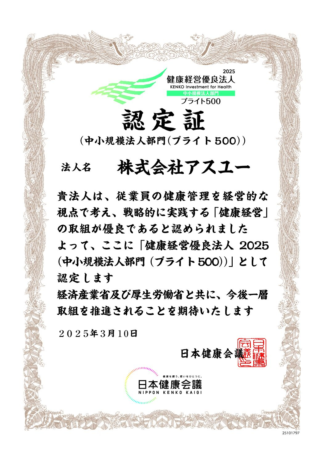 健康経営優良法人制度とは、地域の健康課題に即した取組や日本健康会議が進める健康増進の取組をもとに、特に優良な健康経営を実践している大企業や中小企業等の法人を顕彰する制度です。 健康経営に取り組む優良な法人を「見える化」することで、従業員や求職者、関係企業や金融機関などから「従業員の健康管理を経営的な視点で考え、戦略的に取り組んでいる法人」として社会的に評価を受けることができる環境を整備することを目的としています。 ブライト500とは、健康経営優良法人(中小規模法人部門)の中から 『健康経営優良法人の中でも優れた企業』かつ『地域において、健康経営の発信を行なっている企業』として優良な上位500社に付与されるものです。